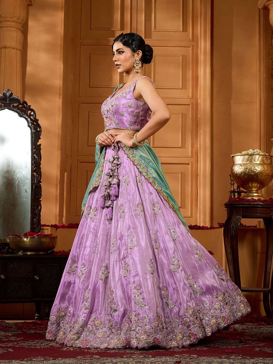 | Other Details | Product Details: Lehenga: • Fabric: Premium Satin Silk in Elegant Lavender • Semi-Stitched with Full Flair (4.0 meters) • Intricate Sequins, Beads, Stone, and Thread Embroidery with Coding Work • Hemline finished with Cutwork Border • Inner: Double Shantoon with Can-Can (12” & 18”) and 2 Layers of Buckram (4” & 12”) for Extra Volume • Length: 42 inches (Customizable Waist up to 40 ”) • Unique Handcrafted Tassel Latkan with Beads & Ethnic Detailing Blouse (Choli): Dupatta: Inclusions: 1 Lehenga + 1 Blouse + 1 Dupatta SINGLE ALSO AVAILABLE REGULAR WEAR |