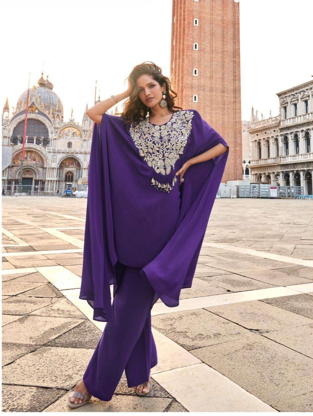 FABRIC – PREMIUM FRENCH CREP SILK / REAL CHINON SILK ( STYLIST LOOK LONG CUT STYLE HAND EMBROIDERED TOP WITH PLAZZO )
